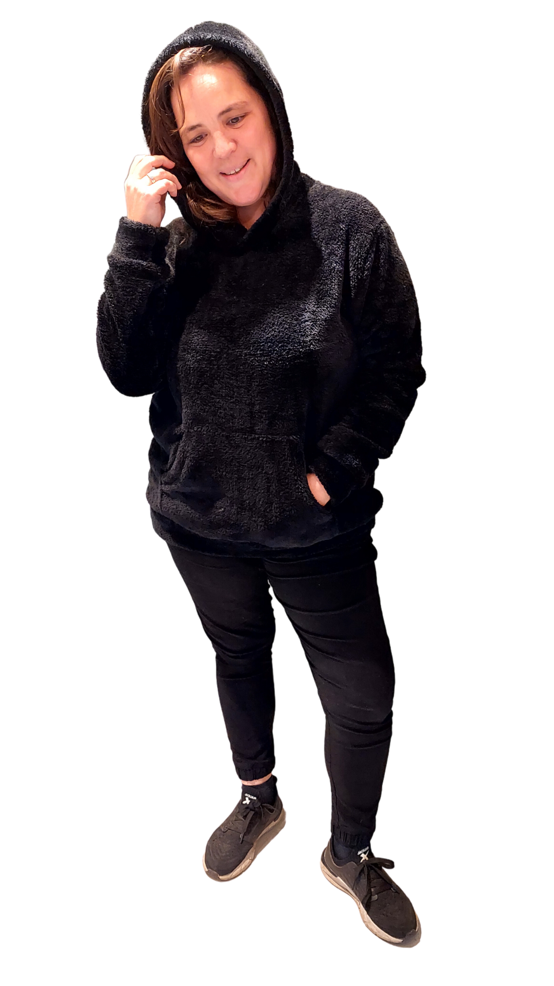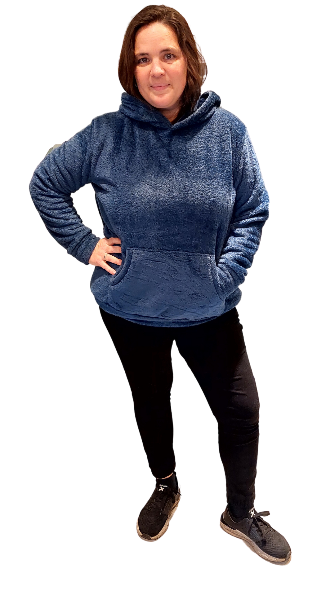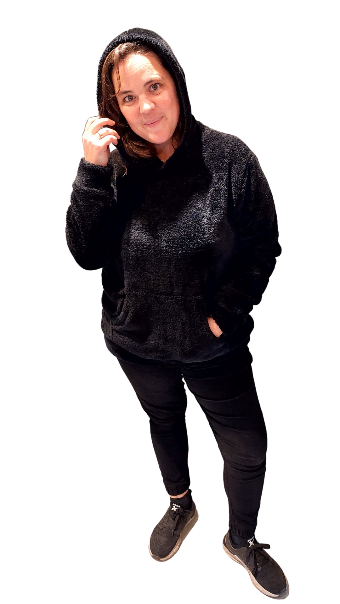 Tiene bolsillo canguro, capucha, cintura y puños, son super amplios y largos.