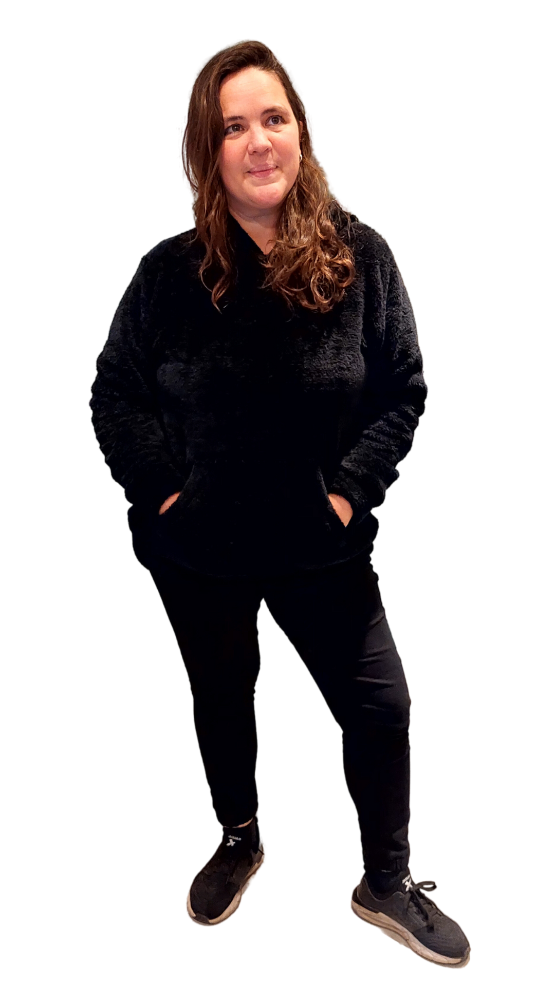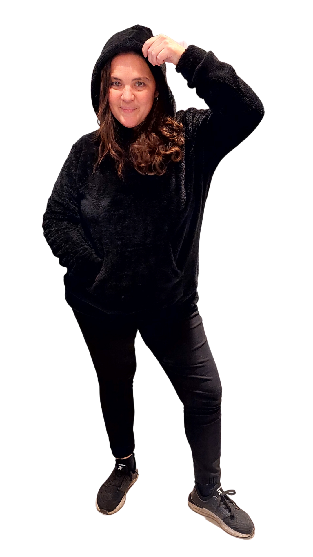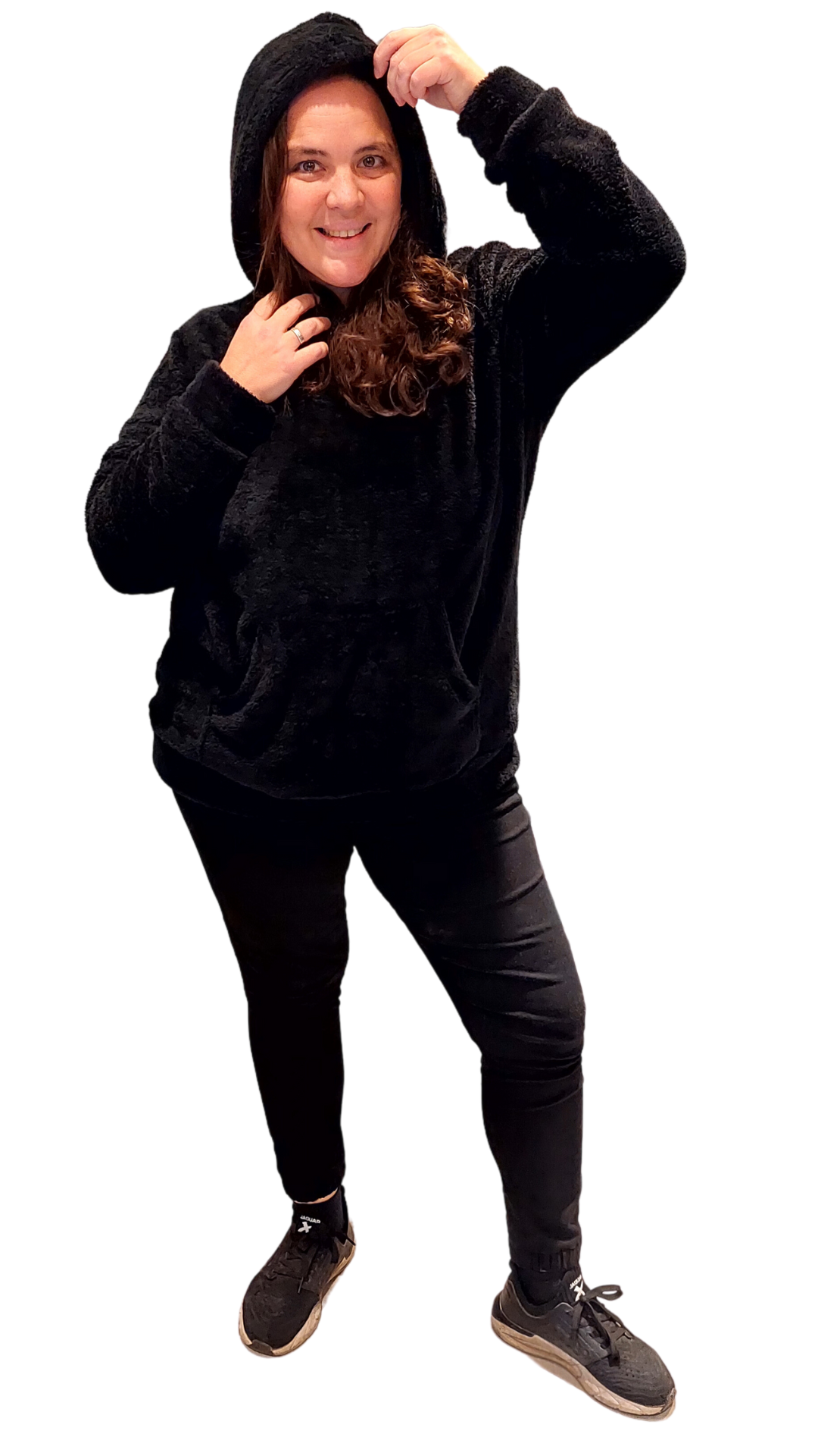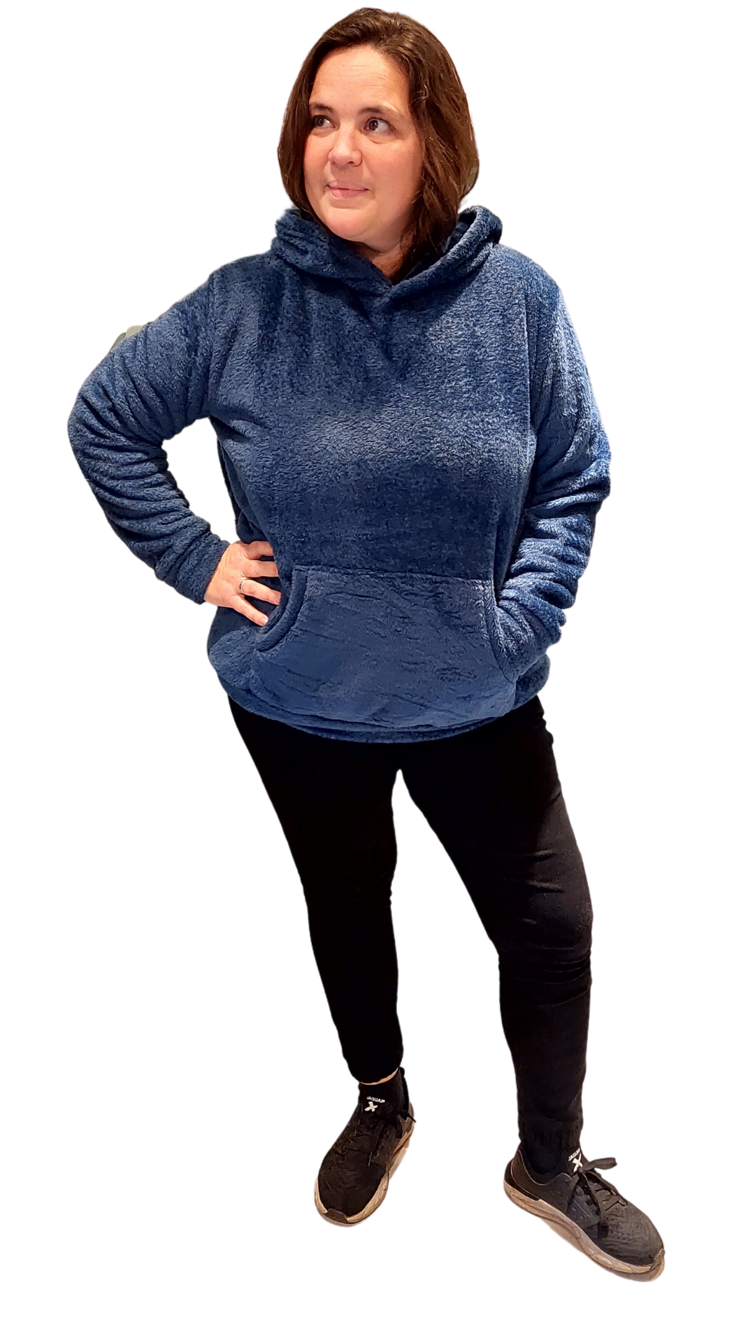 Tiene bolsillo canguro, capucha, cintura y puños, son super amplios y largos.