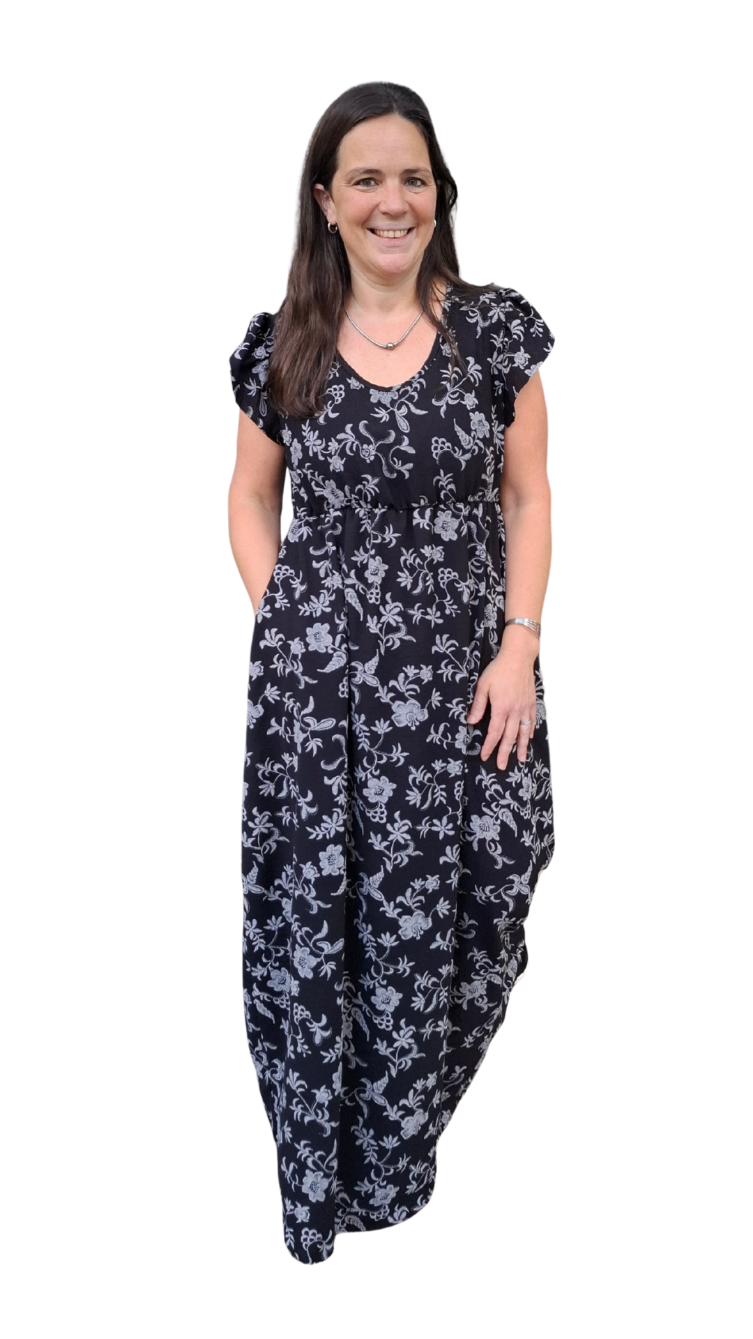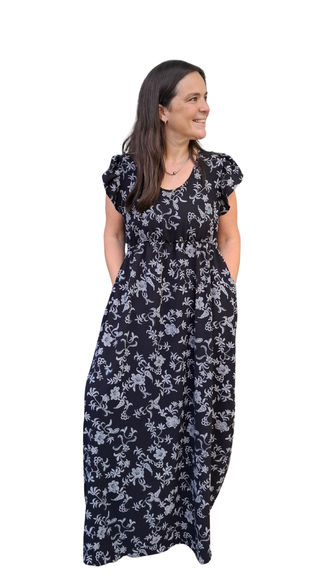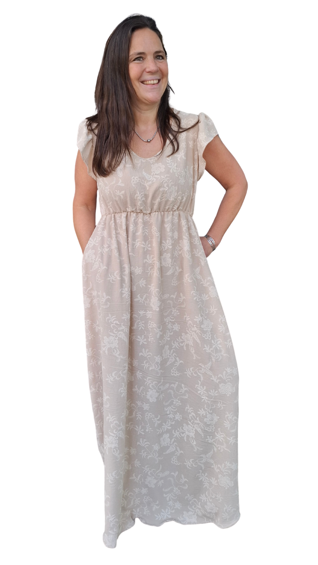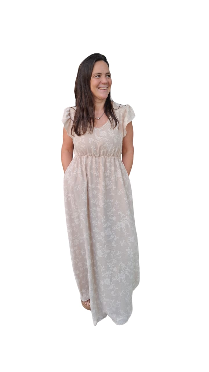 Vestido largo de creppe elastizado con una estampa que da efecto bordado. Tiene un calce y una caída espectacular. Es una tela que da una terminación formal a cualquier look.