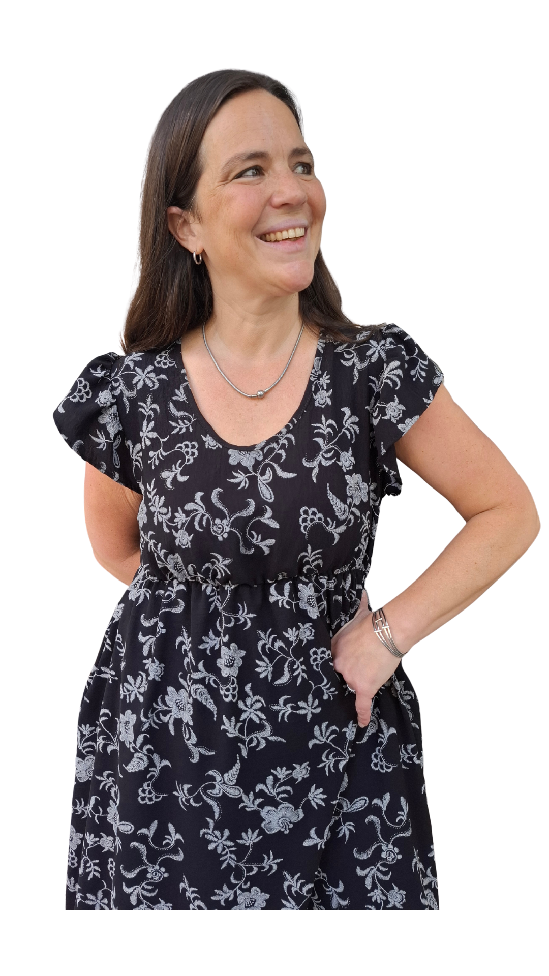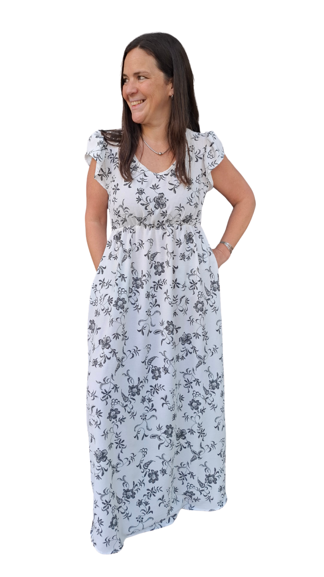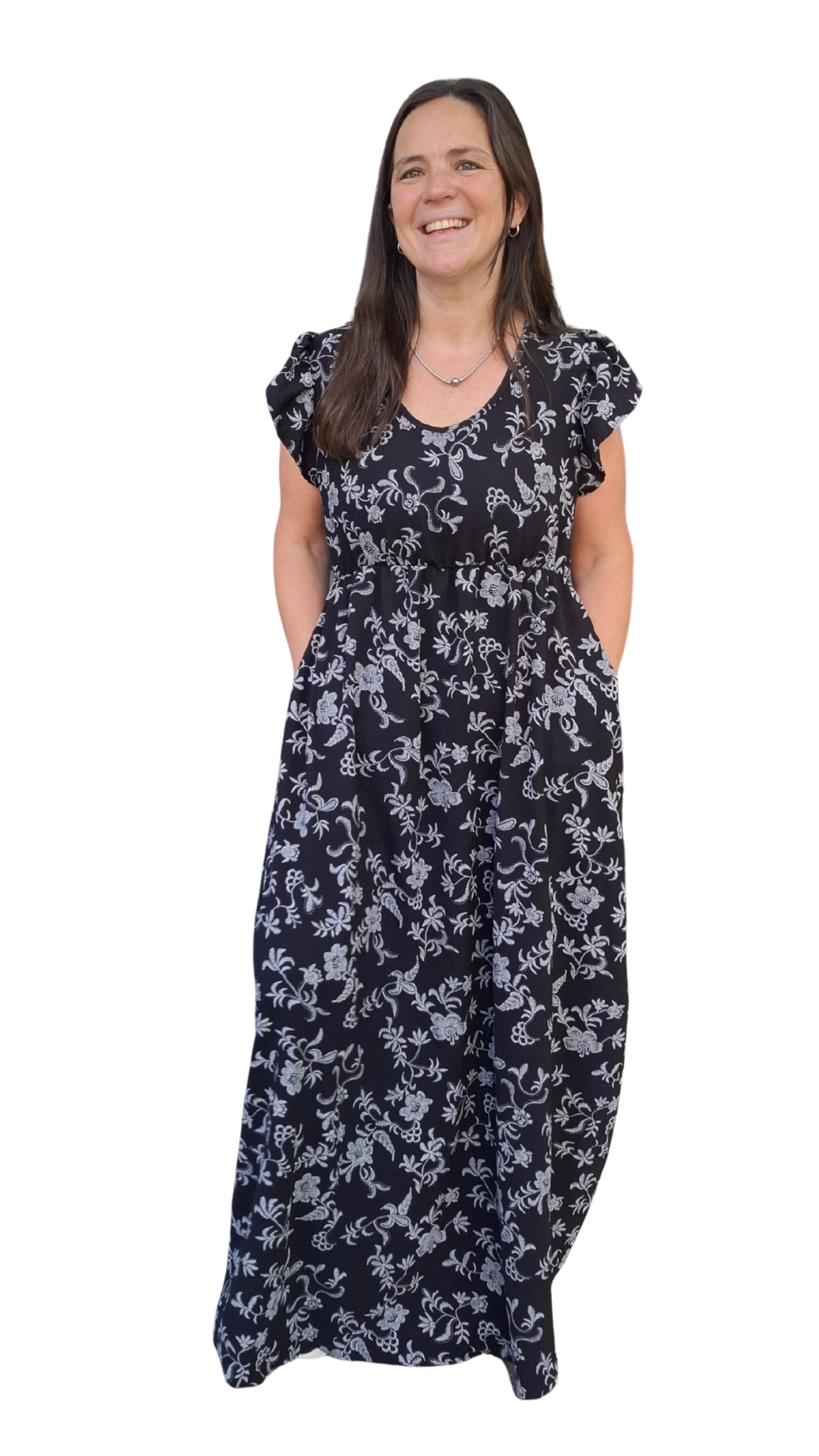 Vestido largo de creppe elastizado con una estampa que da efecto bordado. Tiene un calce y una caída espectacular. Es una tela que da una terminación formal a cualquier look.
